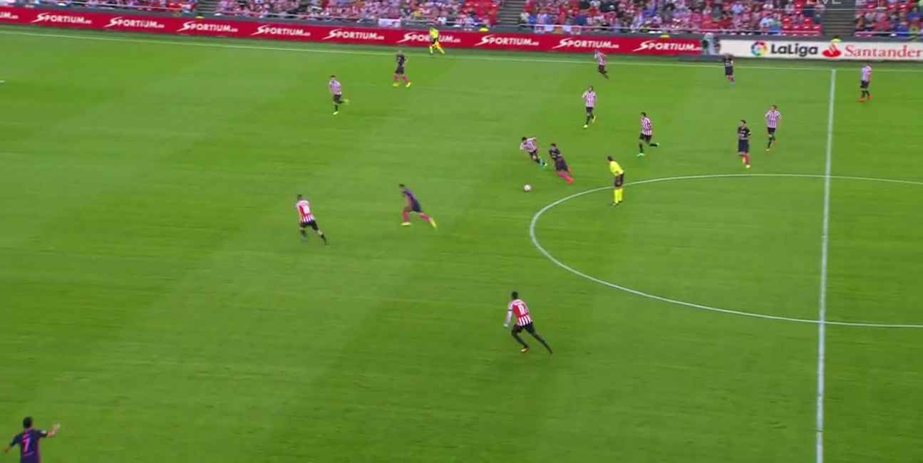 A la tercera, como en las películas, con el desmarque «ciego» de Denis Suárez la posesión culé sí entró en su fase de aceleración, la decisiva, iniciada por un movimiento de apoyo de Luis Suárez viniendo a recibir en dirección contraria a la que enfilaba el seis del Barça. Al uruguayo el balón le llegó entre líneas y de espalda, en un espacio detrás del mediocampo bilbaíno habilitado por sendas carreras de los interiores culés hacia el frente de ataque, pues si en la izquierda Denis corría hacia adelante, también desde el interior derecho, en paralelo, el finalmente goleador Rakitic hacía lo propio. Ambos, amenazando la espalda de la defensa, la separaban de su línea de mediocampistas. Uno se llevó a Aymeric Laporte, y el otro a Óscar de Marcos.